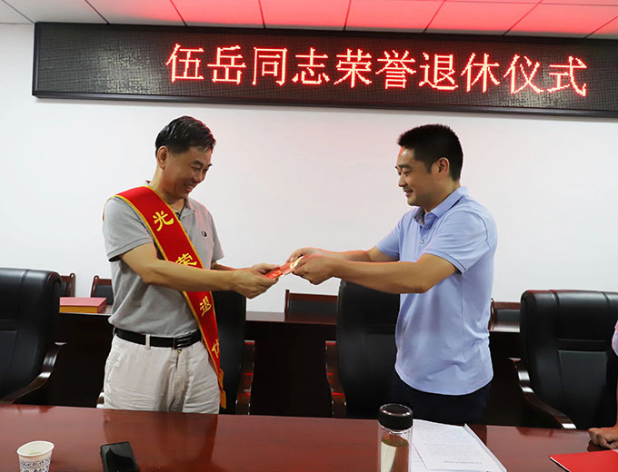 儀式上,董事長陽文林為伍岳同志佩戴了“光榮退休”綬帶,頒發(fā)了“光榮退休”紀(jì)念牌,并代表集團(tuán)公司向伍岳同志為萬寶投各項(xiàng)事業(yè)發(fā)展所作出的貢獻(xiàn)表示崇高的敬意和衷心的感謝?偨(jīng)理徐業(yè)波傳達(dá)了相關(guān)文件精神,介紹了退休同志有關(guān)情況,回憶曾經(jīng)與伍岳同志共同奮斗的情誼和榮耀。工會(huì)代表在座談會(huì)上表達(dá)了感恩與不舍的心情,并送上了溫馨的祝福。