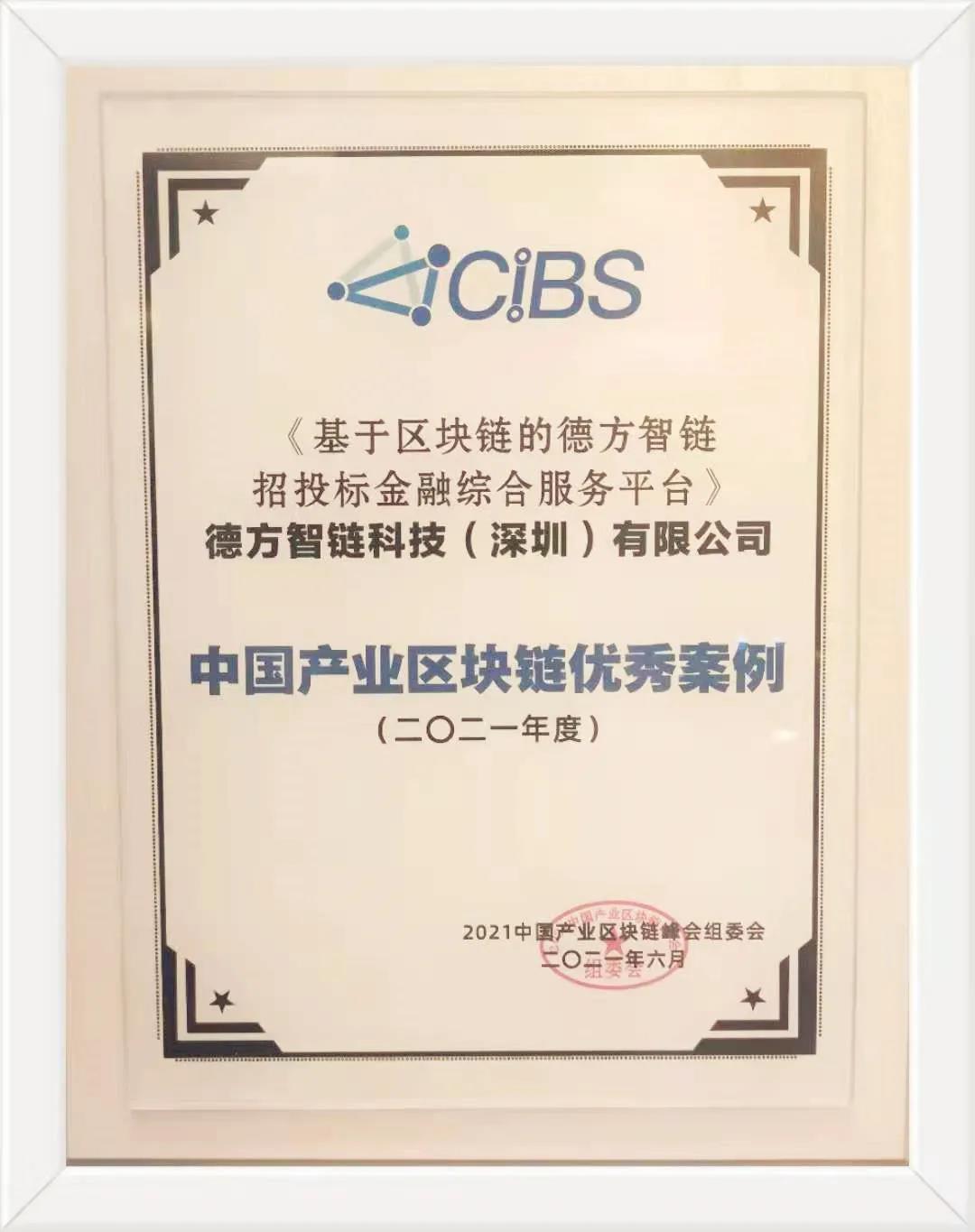 6月3日,2021中國產業(yè)區(qū)塊鏈峰會在湖南長沙隆重舉行,峰會以“產業(yè)驅動 鏈以致用”為主題,云集近百位行業(yè)知名專家、學者、企業(yè)領袖與相關產業(yè)的精英人士。德方智鏈作為產業(yè)區(qū)塊鏈領域的深耕踐行者受邀參會,并憑借在區(qū)塊鏈應用場景鉆研多年所展現出的不俗成績和專業(yè)能力,基于區(qū)塊鏈的招投標金融綜合服務平臺,榮膺“2021年度中國產業(yè)區(qū)塊鏈優(yōu)秀案例獎”。